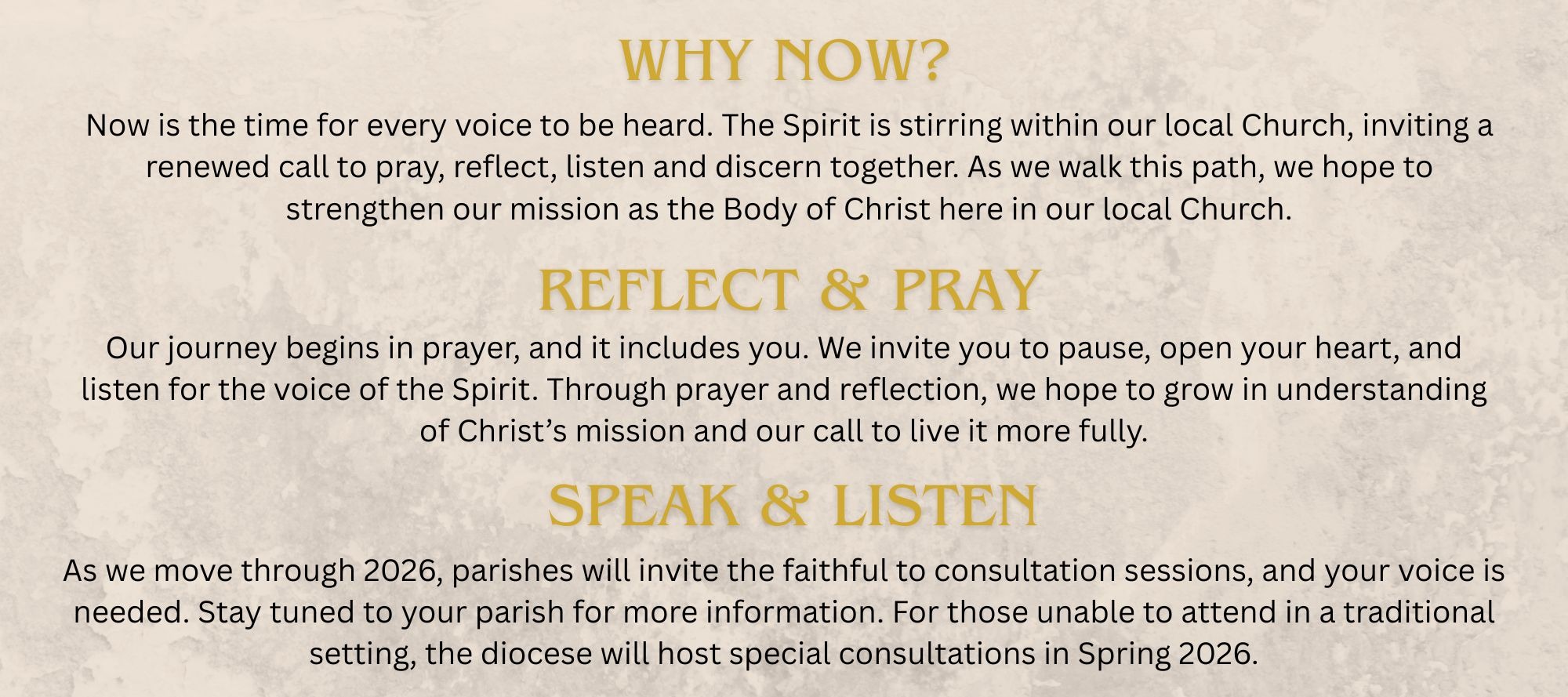 All faithful are called to participate through prayer and reflection. You have a voice to share and an ability to listen, and your presence at your parish consultation session is unique and irreplaceable.